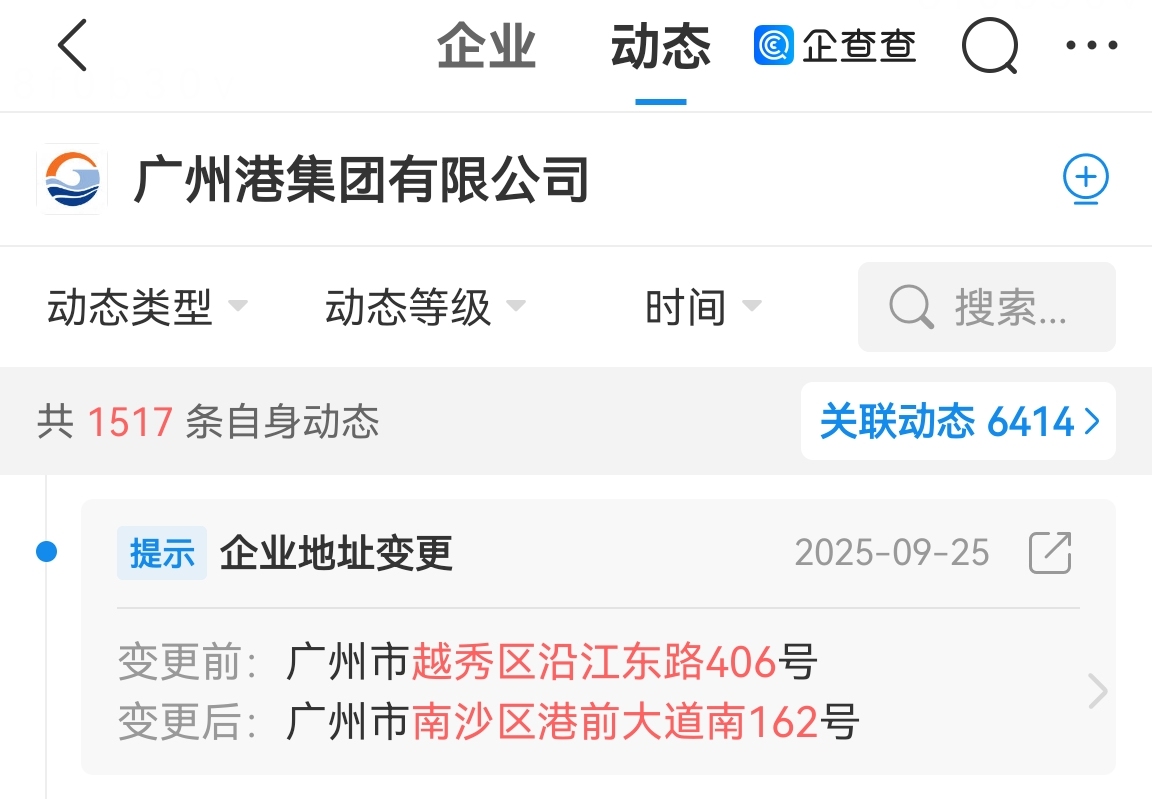 记者从企查查APP获悉利创智投,9月25日,广州港集团有限公司企业地址由“广州市越秀区沿江东路406号”变更为“广州市南沙区港前大道南162号”。