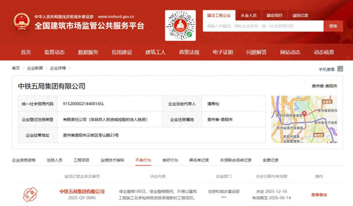 日前,全国建筑市场监管公共服务平台信息显示,中铁五局集团有限公司(以下简称“中铁五局”)被住房和城乡建设部实施停业整顿180日广瑞网 广瑞网 广瑞网 ,决定时间为2025年12月16日,有效期至2026年6月14日。停业整顿期间,不得以建筑工程施工总承包特级资质承揽新的工程项目,涉及的具体事由未公开。